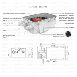 All-in-one pump & float switch. No additional float switch required. Pump turns on when water level rises & shuts off when water is removed. SEAFLO shower sump pump system with multiple inlet ports for versatile usage. Clear screw-down cover and removable mesh filter for easy replacement or in the event that the pump becomes clogged with debris.
